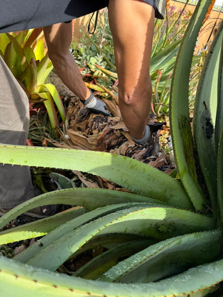 Originally, we intended to plant it near the fence in full sun at the base of the hill. However, once we began digging, we quickly realized, as we had feared, that the area was filled with Eucalyptus roots from the trees just outside the fence. Upon reassessing, we decided it could serve as an even better focal point if placed in the middle of an existing bed where I had planted a Psuedobombax ellipticum. While it was doing well, it was leafless most of the year and didn't stand out much. I removed it and gave it to my good friend Jodi for her garden. We dug a large, deep hole and managed to balance the aloe in place. We backfilled the hole with decomposed granite and compacted it. We were able to get it to stand without any support and hope it will be rooted by next December, showcasing a beautiful display of flowers.