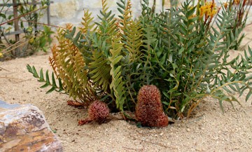I met banksia plants for the first time. A trip to Walter Andersen’s introduced me to this beauty, Banksia blechnifolia. It has the peculiar charm of blooming right out of the ground in front of foliage that begins orange and becomes deep green.