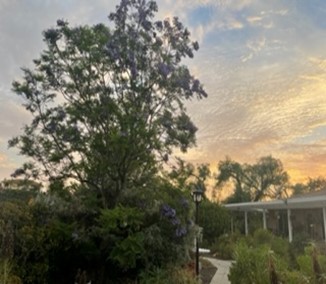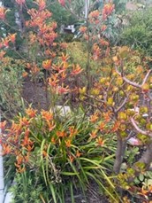 … I am being rewarded after several years of drought. The rain allows my jacaranda tree to go crazy with blooms and makes me super happy to view. The orange cross Aniozanthus are enjoying the sun! The sedum never fails. And the agaves are happy. One is even blooming. I believe it is a blue agave.