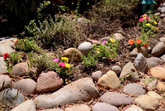 … My guess is everything is being helped by the sun's energy. I just have to help things along with returning to watering after the rains and the months of gray and gloom. Many plants are hunkering down for the dry summer to come. The Chitalpas are in glorious bloom, like never before. The pomegranate blossoms are swelling at their bases. I tend the portulaca rock garden, which for me is the essence of summers spent at my grandmother’s. Basically, I just keep an eye out for any water stressed plants. Given the prevalence of natives and Australian and South African plants in the garden, there should not be many (except of course for tomato) of summer’s irresistible water hogs.